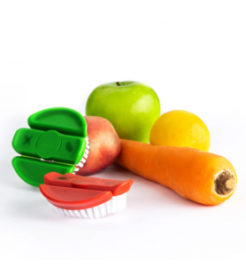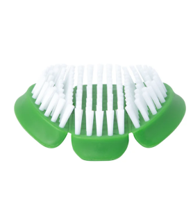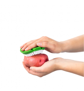 While the stiff bristled, green Vegetable Brush is designed for thick skinned/root vegetables like potatoes, carrots, cucumbers or celery. Both brushes feature a three-section grip design that gently flexes in your hand for a better and more comfortable grip.
