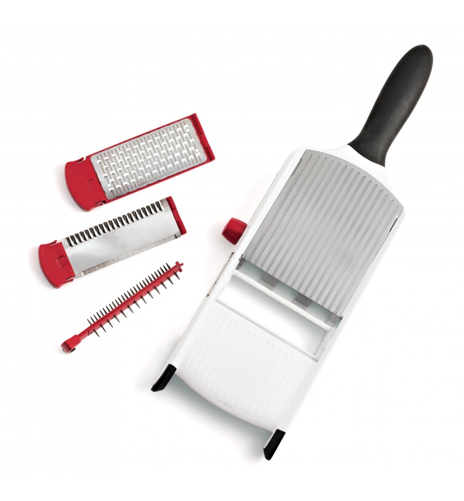 Pièces incluses : Mandoline, lame à râper, lame ondulée/gaufrée, lame droite.