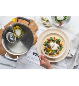 Le cuiseur à œufs Cuisipro est l'outil idéal pour réussir vos œufs pochés à tous les coups. Grâce à ses perforations spécialement conçues, l'eau circule autour de l'œuf, le pochant délicatement à la perfection. Son crochet sécurisé s'accroche facilement au bord de votre poêle, vous permettant de pocher plusieurs œufs en même temps en toute simplicité.