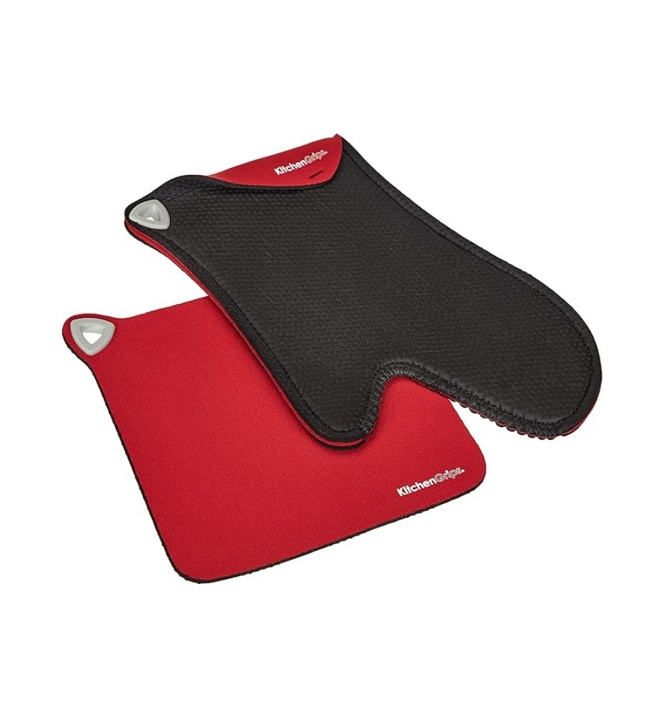 Ce matériau est non seulement résistant à la chaleur et aux taches, mais aussi flexible et confortable. Animée par une vision d'avenir, Kitchen Grips® développe et améliore constamment ses produits et sa gamme. De la création de différentes tailles à la conception de maniques extensibles, Kitchen Grips® continuera de produire des produits de la plus haute qualité et d'explorer de nouvelles pistes.Grips Set de 2 pièces gants et manique