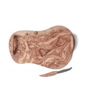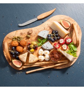Grand plateau à fromage en bois d'olivier pour découpe et service avec con couteau à fromage et ses poignées pratiques.